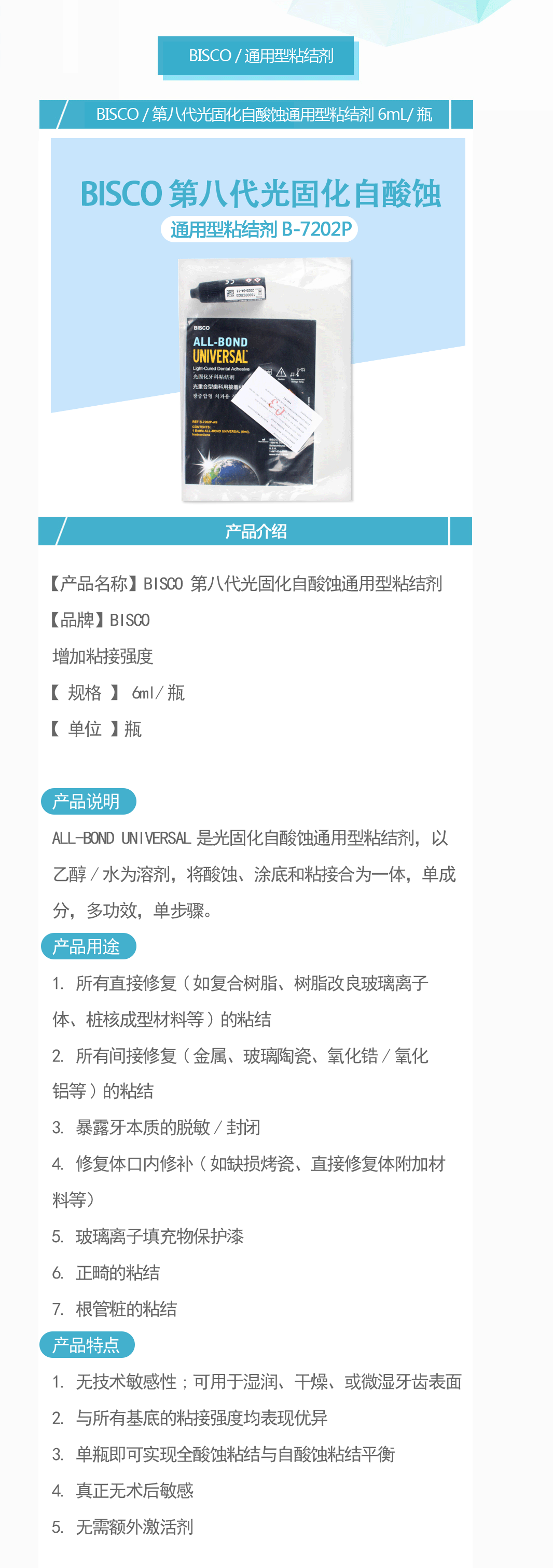 产品名称:第八代光固化自酸蚀通用型粘结剂