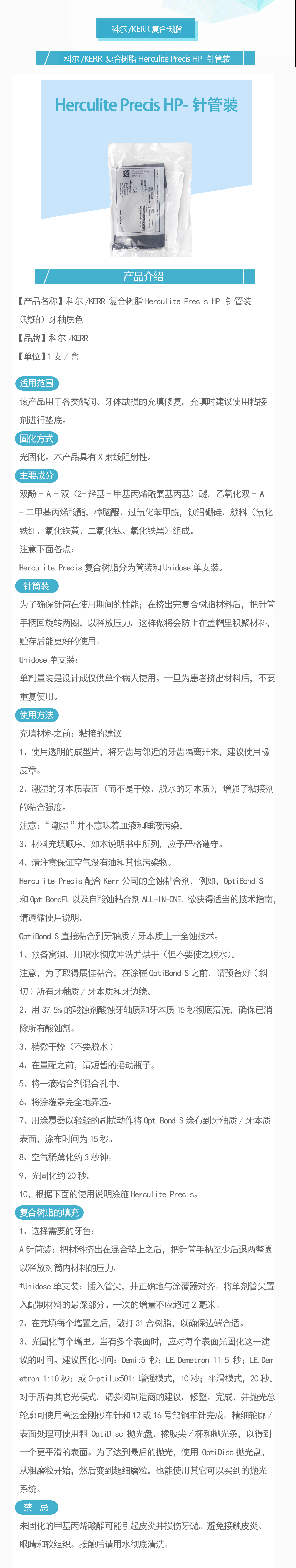 产品名称:复合树脂Herculite Precis HP-针管装(琥珀)牙本质色