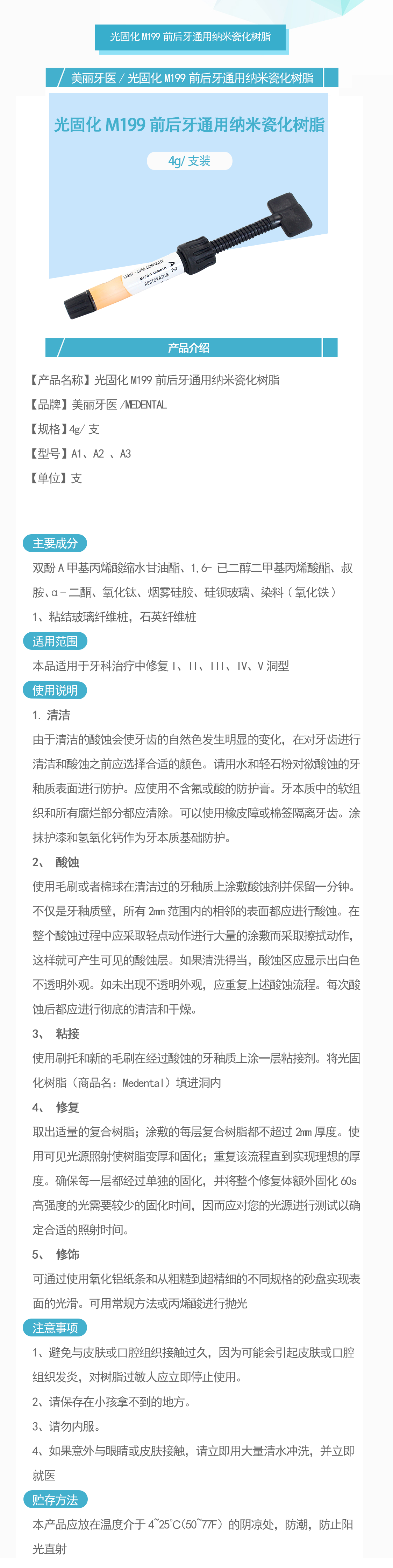 产品名称:光固化M199前后牙通用纳米瓷化树脂