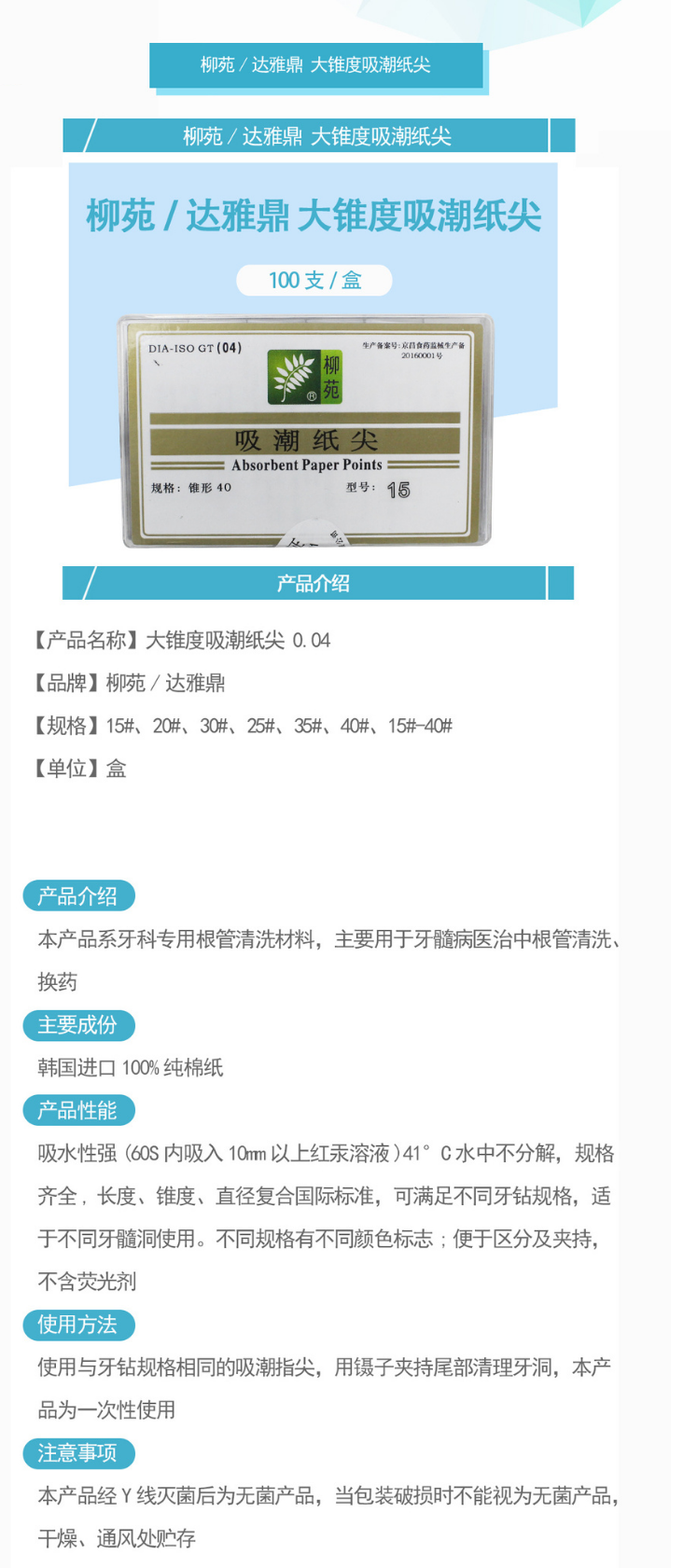 产品名称:柳苑/达雅鼎 大锥度吸潮纸尖 0.04