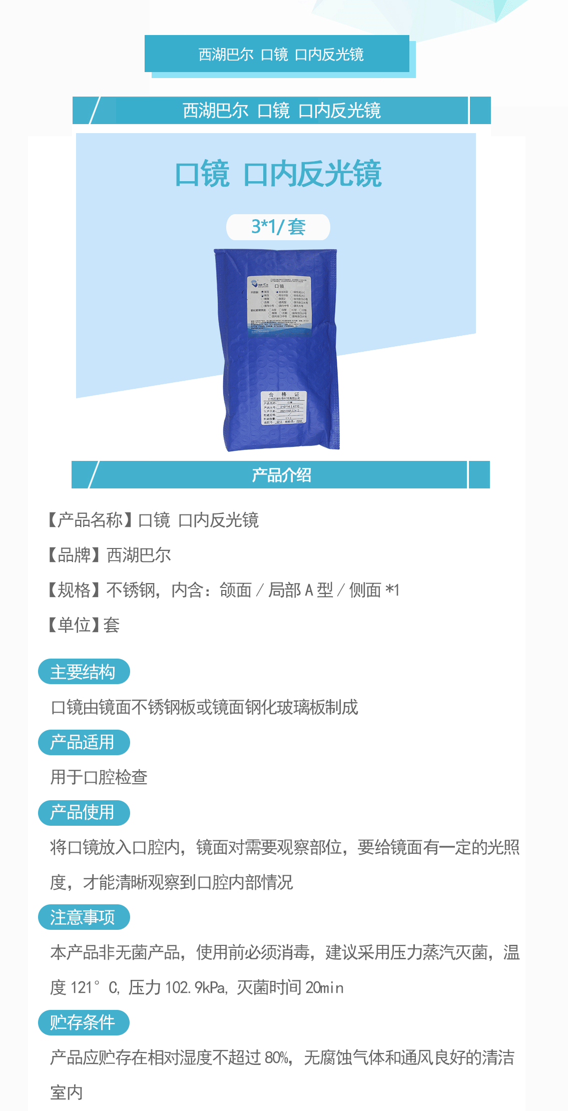 西湖巴尔 口镜 口内反光镜 不锈钢 XH-I410-11,内含:颌面/局部A型/侧面*1