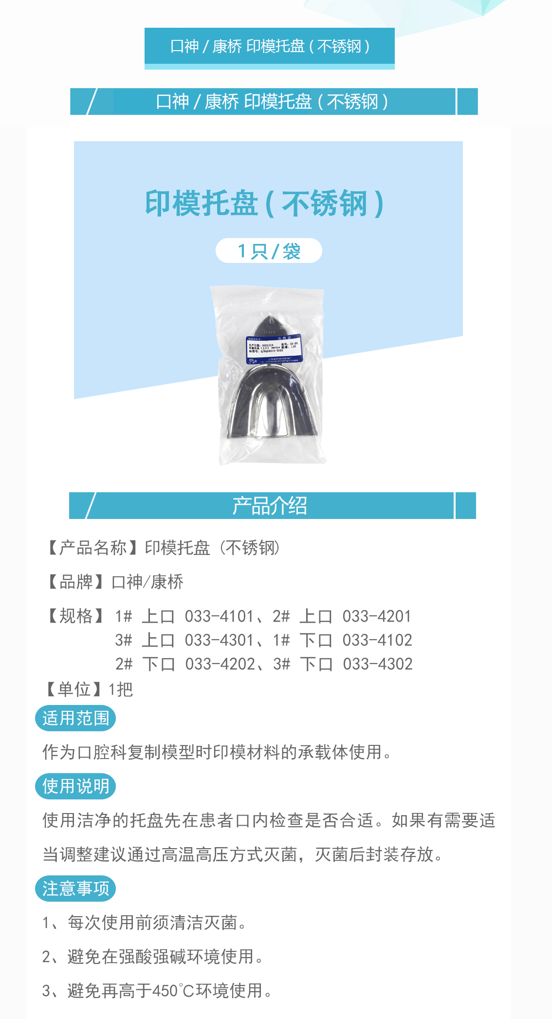 产品名称:印模托盘 不锈钢 无孔平底